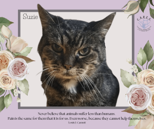 We had Suzie in for a check up at our vet and she is in incredible health for her age. We believe her to be approx 16 years old. Suzie is so content and has absolutely flourished with all of the love and attention she received here. All of us volunteers fell in love with her immediately. Each time someone would enter the senior room she would come down from her little perch to chat and visit. She is the sweetest, friendliest little lady.